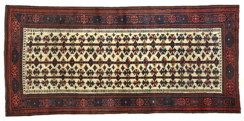 Technik:Sennehknoten; Kette:Naturwolle, Schuss:Wolle und Ziegenhaar, Flor: Wolle und Baumwolle
