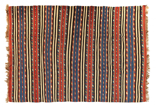 Kette: Wolle naturfarben; Schuss: buntfarbene Wolle; Flor: buntfarbene Wolle; Technik: Kelim-Technik