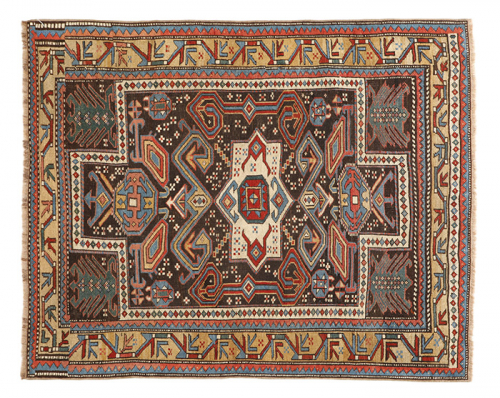 Technik: symmetrischer Knoten; Kette: Wolle, Schuss: Baumwolle, Flor: Wolle