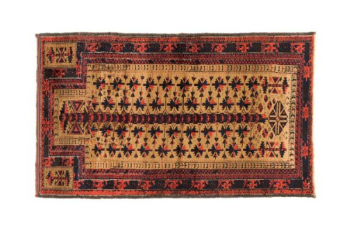 Belutsch Gebetsteppich Ostpersien, 19. Jahrhundert Größe: 185 x 105 cm Kette: narurfarbene Wolle gezwirnt Schuss: dunkelbraune Wolle Flor: Kamelhaar Technik: Sennehknoten Knotenzahl: 50 pro 10 cm Kette 25 pro 10 cm Schuss Schirasi: vierfach, Ziegenhaar