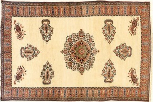 Flor: buntfarbige Wolle Kette: hellbeige Baumwolle Schuß: hellbeige Baumwolle Technik: Sennehknoten Knotenzahl: 70 pro 10 cm Kette 70 pro 10 cm Schuß