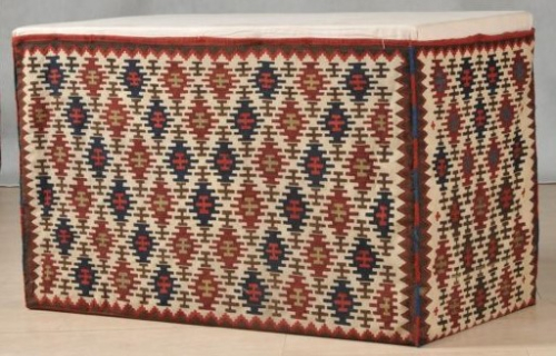 Schlitzkelim Technik feinste Arbeit Kette: hellbeige Wolle Schuß: buntfarbene und weiße Baumwolle, musterbildend