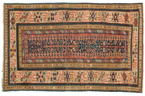 Flor: Wolle Kette: naturfarbene Wolle Schuß: 2fach, teilweise 3fach rote Wolle Technik: Ghiordesknoten Knotenzahl: 40 pro 10 cm Kette 30 pro 10 cm Schuß Schirasi: 4fach rote Wolle Abschlüsse: oberer und unterer Kelim- Ansatz, teilweise restauriert Literatur: Brüggemann/Böhmer "Teppiche der Bauern und Nomaden in Anatolien" Tafel 58