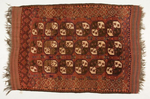 Kette: Ziegenhaar; Schuss: Wolle und Ziegenhaar; Flor: Wolle; Technik: Senneh-Knoten, Flor: Wolle Kette: naturfarbenes Ziegenhaar Schuss: braunrote Wolle Technik: Sennehknoten Knotenzahl: 20 pro 10 cm Kette 20 pro 10 cm Schuss Schirasi: 4fach dunkelbraunes Ziegenhaar Abschlüsse: Kelim original beidseitig Literatur: Turkmen Tribal Carpets and Traditions The Textile Museum Washington D.C. Tafel 85