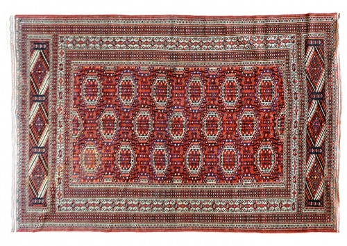 Kette: Wolle und Ziegenhaar; Schuss: Wolle; Flor: Wolle; Technik: Senneh-Knoten