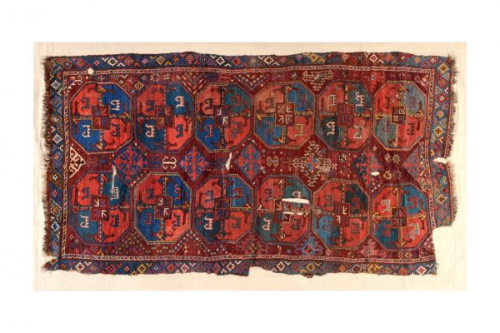 Flor: Wolle Kette: dunkles Ziegenhaar Schuss: Ziegenhaar Technik: Sennehknoten Knotenzahl: 30 pro 10 cm Kette, 15 pro 10 cm Schuss